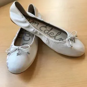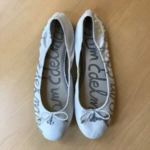Sam Edelman white leather flats with silver accents. Features a delicate bow and logo detail.
