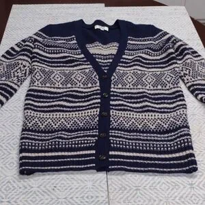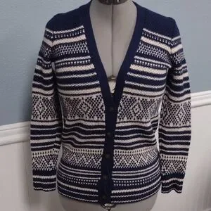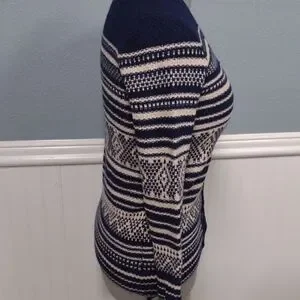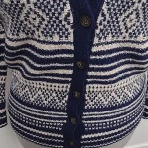 Chic navy and cream cardigan with intricate patterns. Ideal for layering and adding style.