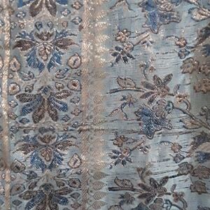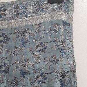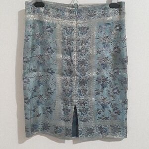 This chic floral pencil skirt features a beautiful blue hue, perfect for adding elegance to your wardrobe. Ideal for both casual and formal occasions. This skirt is so pretty. It is unique because I had it made for me from vintage metallic threaded fabric. Though I love it, unfortunately, it is too small for me. It is unlined. The last picture shows the inside of the skirt. There is no stretch. Approximate measurements: Waist 15"/38 cm Hips 17"/43 cm Length 21"/53 cm