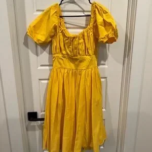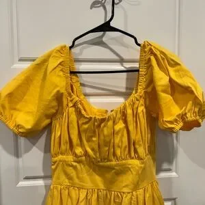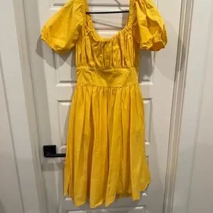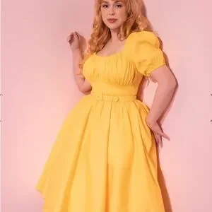 Chic yellow midi dress with puff sleeves. Flattering fit and vibrant style. Perfect for any occasion.