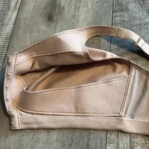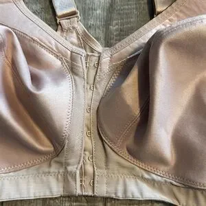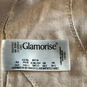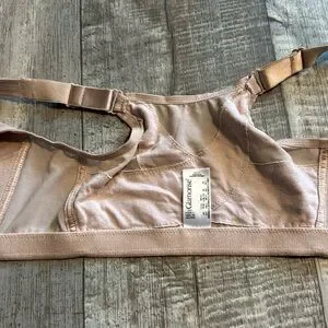 Like new but used condition women’s bra made by GLAMORISE. Size 38G-reinforced material under the cup area for added support. This has no wires/under wire. Six hook and eye front closure. Nude in color.