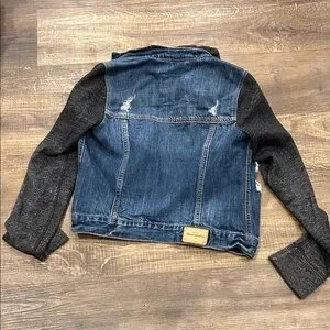 Stylish denim jacket. Worn details on front and back. Stretchy knit layered-look dark gray hoodie. EUC. Casual cool. Pair with slouchy pant and sneakers. Layer over a tank and shorts.