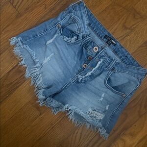 Trendy distressed jean shorts with frayed hem. Perfect for casual wear. Comfortable and stylish.