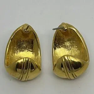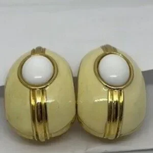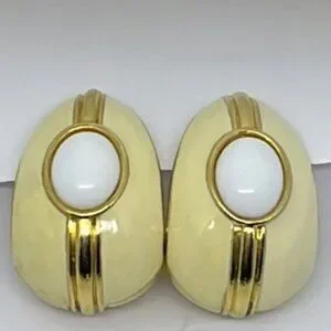 Gorgeous vintage gold tone with creamy enamel and thermoset cabochon center pierced earrings.
