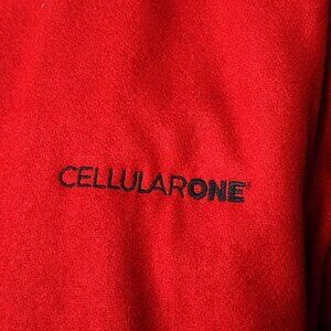 Vintage Delong Cellular One Varsity Jacket in vibrant red and black. This unique, vintage men's XXL jacket features the Cellular One logo on the right front. Made in the USA from a wool blend.