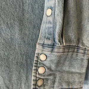 Stylish light blue denim shirt. Features button-down front and chest pockets. Ideal for casual wear.
