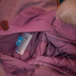 Columbia jacket in lavender. Features a hood with faux fur trim. Size XL.