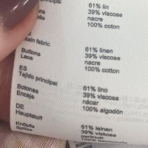 Main fabric: 61% linen, 39% viscose Buttons: 100% nacre Lace: 100% cotton