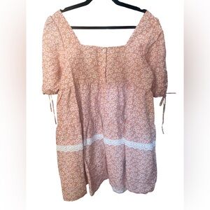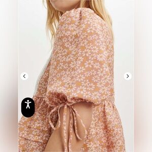 Short, loose-fitting dress with daisy print. Viscose and linen blend. Short, loose sleeves with ties at the bottom.
