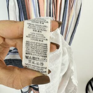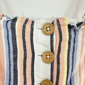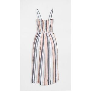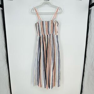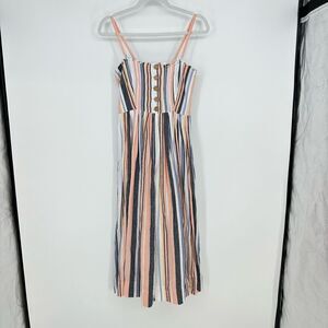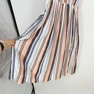 Chic midi dress with vertical stripes. Features buttoned front and spaghetti straps. Perfect for casual outings.