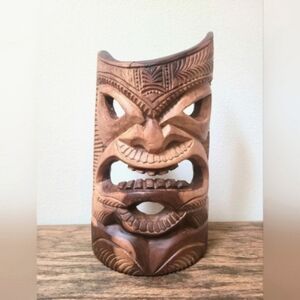 Intricately carved wooden tribal tiki mask. Rich brown tones add warmth to any space. Perfect for wall decor or shelf display.