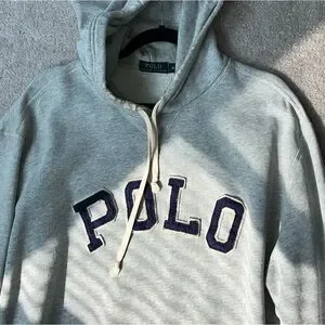Classic gray sweatshirt featuring bold navy 'Polo' lettering. Soft and comfortable for everyday wear. Signature style by Ralph Lauren.