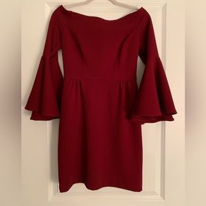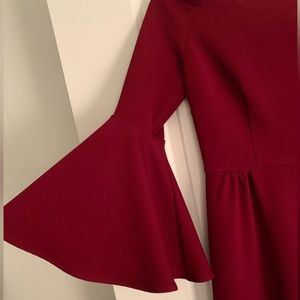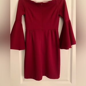 Off the shoulder, bell sleeves, color is maroon. Concealed zip closure middle of back. No size tag but measurements are size 4. It measures 30” armpit to armpit and 30.5” in length. Retail is $260. Worn once and in perfect condition.