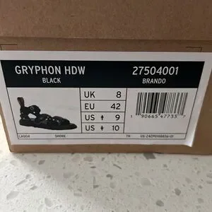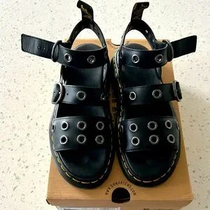 Stylish black sandals with silver eyelet accents. Adjustable straps for comfort. Iconic Dr. Martens design.