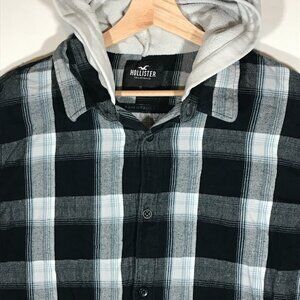 Hollister Men's XL Black Plaid Long Sleeve Button Up Hoodie Flannel Shirt
