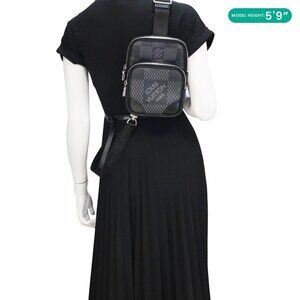 The Louis Vuitton Amazone Sling in Damier Graphite canvas offers a sleek, modern crossbody style. Its compact shape and adjustable strap make it perfect for hands-free daily wear.