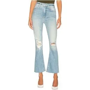 These high-rise flare jeans have an ankle-length inseam and a raw frayed hem. Cut from SUPERIOR semi-rigid denim, Rope's End is a light blue wash with subtle whiskering, fading and distressing at the knee. MOTHER knows the ropes.