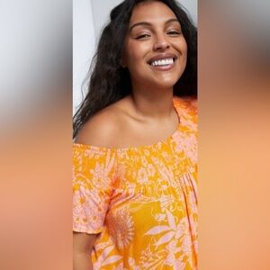 Activate vacation mode in this flowing long maxi — featuring a vibrant orange and pink pattern. Beautiful smocking detail - pockets make it perfect.