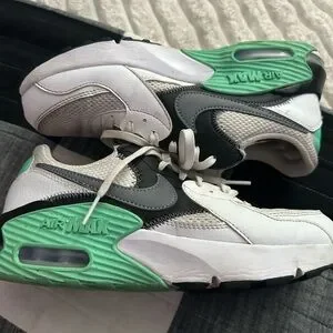 Nike Air Max sneakers with a sleek white and gray design. Features vibrant green accents. Ideal for everyday style.