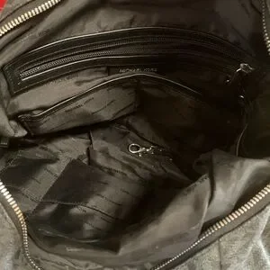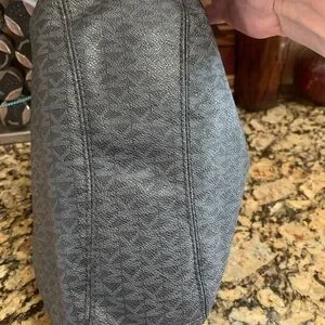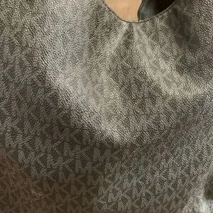 Chic and versatile bag. Features signature MK pattern. Perfect for daily use. The bag has 3 huge compartments. The outside 2 snap closed and the middle one zips closed. It has leather straps with a silver chunky chain. There are 2 large MK silver logos where straps meet purse. The interior is a satin MK logo fabric. There is a large zippered pocket inside as well as 6 open pockets. This purse can hold a lot! In great condition with no stains or tears.