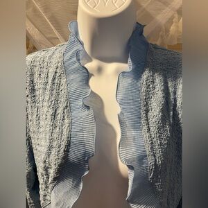 Light weight, comfortable, flirty and adorable! It’s a beautiful soft blue-grey. 95%spandex 5% elastic… love the crinkle look with the feminine ruffle. Pair over a cute tank or spring dress for that perfect amount of cover! Could easily dress up any outfit. New with tags