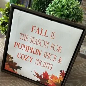 Simply Beautiful! Rustic Cottage Farmhouse Harvest Canvas Wall Art with Chocolate Brown Wood Frame wall art. Features autumn leaves and text in orange that reads Fall Is The Season For Pumpkin Spice & Cozy Night accented with Autumn Maple 🍁 Leaves! Can be hung with sawtooth hanger on the back or use tabletop! A beautiful accent for your home this harvest season display Halloween through the Thanksgiving holiday! Pair as well with farmhouse, French country, bohemian, neutral, vintage Flea Market, and cottage decor styles! 9” x 9”