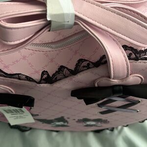 Adorable heart-shaped bag in pink with black lace accents. Perfect for adding a cute touch to any outfit.
