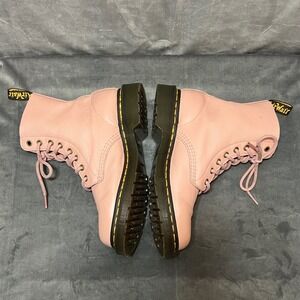 Soft pink Dr. Martens 1460 Pascal ankle boots in pebbled Virginia leather. Classic 8-eye lace-up style with AirWair sole. Gently worn with minor scuffs and signs of use. Women's US size 8.