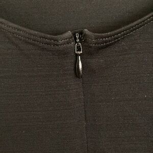 Sleek black muscle tee with hidden zip closure. Convenient zippered rear pocket for essentials. Ruched detailing for flattering fit. Normal wash wear. No holes, no rips.