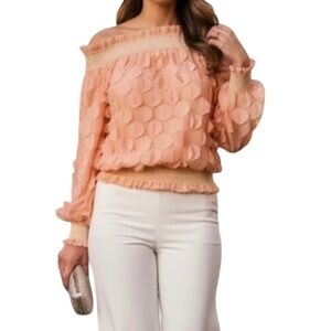 Turn heads in this eye-catching Nancy peach top, new with tags. Featuring an off-shoulder design with smocked stretch trim, it’s adorned with structured 3D hexagon appliqués that add a high-fashion, dimensional look. The lightweight fabric is soft, breathable, and beautifully detailed with ruffled edges at the neckline, hem, and cuffs.