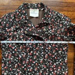 Stylish floral bomber jacket. Features a vibrant pattern. Zipper details on front and sleeves. Perfect for casual outings.