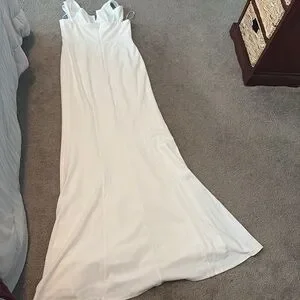 This stunning white off-shoulder gown is perfect for any formal occasion. Its elegant design and classic color make it a timeless addition to your wardrobe. Only worn once and washed on delecate. Some light staining on bottom under slip. Price adjusted.