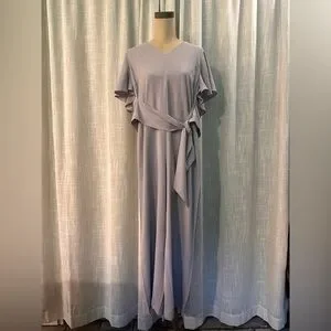 This elegant gray jumper features a flattering V-neck and stylish ruffle sleeves. Perfect for any occasion, it offers a comfortable fit with a chic waist tie.