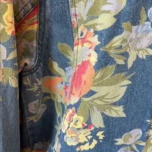 Stylish jean jacket with vibrant floral print. Button-front closure. Perfect for casual outings.