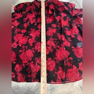 Chic sheer V neck blouse with bold red floral design on black. Has metallic chip dots throughout which makes it Ideal for elegant occasions. Long sleeves with elastic at the bottom and ruffles halfway down. Button up front closure