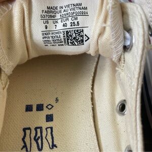 New without tags. Converse sneakers in off-white canvas. Features red trim and iconic design. The tiniest imperfections from wearing once indoors. From a pet-free and smoke-free home.