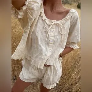 Inspired by romantic victorian sleepwear, the Romeo Sleep Set includes a pair of boxer shorts and a flowy, feminine top; Designed to keep you cool and comfortable during the warmer months. Made from 100% cotton voile, this set features trimmed ruffles, functional buttons, a thin tie around the neckline, and an elastic waist. Wear this set as pajamas or style with a pair of boots or dainty flats for the sweetest daytime look.