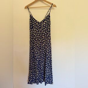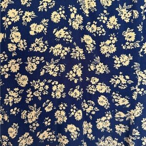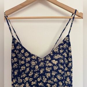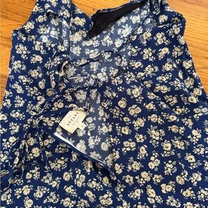 Embrace elegance with this stunning floral blue dress from Sezane. Perfect for any occasion, it features a flattering fit and delicate spaghetti straps that have cross ties in back. Zipper closure. Only worn once, in new perfect condition. Flattering, feminine, French. Size 40.