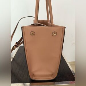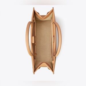Chic Tory Burch tote in light sand. Features iconic logo detail. Perfect for daily elegance.