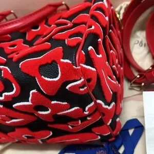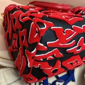 Eye-catching Louis Vuitton satchel with vibrant red and black pattern. Elegant and luxurious design.