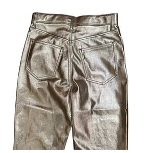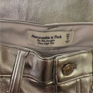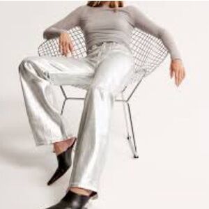 Abercrombie and Fitch Silver Metallic High-Rise 90’s Straight Pants. NWT. Chic metallic pants with high-rise, straight fit, button and zip front closure, standard 5-pocket, vegan leather. 14” waist, 12” rise, 31” inseam.