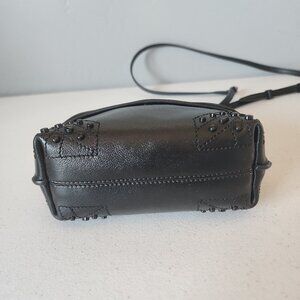 "LIKE NEW" Gorgeous Black Leather Micro Wave Bag By Tod's. Flap Magnetic Snap Closure with Wrap Side Snap Down, Mini Top Handel & Long Adjustable Crossbody to Short Strap, Purple Suede Interior, Made in Italy, Black Studded Sides/ Corners with Stitch Detail, Bag Measures approx. 5" T X 6.5" W X 2.5" D, Like New Condition, No Wearing/Corners/Stains, Used Once, Dust Bag:) Rt.525.00 approx. * This Bag is So Fabulous Looking in Person, Last 2 Stock Photos Size & Look On. Perfect Event/Date Night Bag!