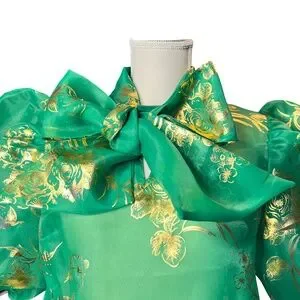 Make an unforgettable entrance with this statement green and gold organza puff sleeve blouse from Nancy New York. This luxurious top features dramatic structured puff sleeves, a bold oversized front bow, and shimmering gold floral print throughout. Crafted from a lightweight organza blend (65% cotton, 35% polyester), it's perfect for elegant events, holidays, or fashion-forward brunch looks. The sheer body adds a modern touch of allure while the exquisite construction keeps it polished.
