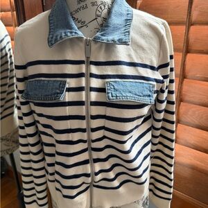 NWOT LOFT Blue and White Denim-Trim Cardigan
