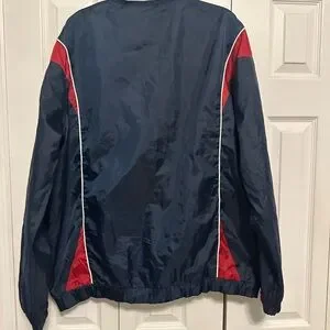Stylish navy pullover jacket with red accents. Features logo on the front.