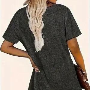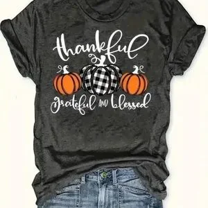 Women's Charcoal Gray Crew Neck T-Shirt with 'Thankful Grateful and Blessed' graphic. Features orange and black plaid pumpkin design.