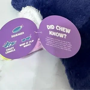 Soft and cuddly plush toy. Perfect for pets. Features a cute pink head and navy blue wings.