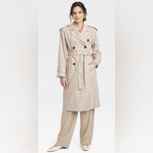 Chic beige trench coat with double-breasted design. Stylish and versatile for any wardrobe.