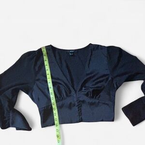 Forever 21 Women’s Black Satin Poly Blend Long Sleeve V-Neck Crop Blouse Size L