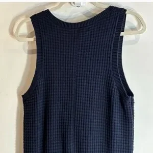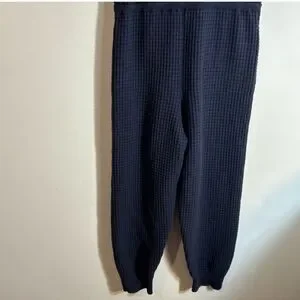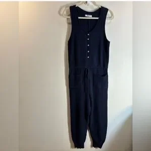 Stylish navy jumpsuit with button front. Features a drawstring waist and pockets. Comfortable and chic.